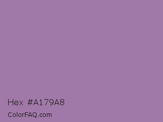 Hex #a179a8 Color is a normal purple color and the nearest color is Purple Mountains Majesty #9678b6. Hex code #a179a8 and RGB value is rgb(161,121,168). In RGB color space, this color is composed of 63% red, 47% green, 66% blue, In CMYK color space, this color is composed of 4% cyan, 28% magenta, 0% yellow , 34% black , In HSL color space, this color has a hue angle of 291° , 21% saturation and 57% lightness.