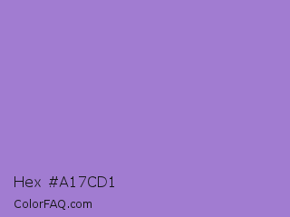 Hex #a17cd1 Color is a light violet color and the nearest color is Lilac Bush #9874d3. Hex code #a17cd1 and RGB value is rgb(161,124,209). In RGB color space, this color is composed of 63% red, 49% green, 82% blue, In CMYK color space, this color is composed of 23% cyan, 41% magenta, 0% yellow , 18% black , In HSL color space, this color has a hue angle of 266° , 48% saturation and 65% lightness.