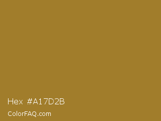 Hex #a17d2b Color is a normal orange color and the nearest color is Luxor Gold #a7882c. Hex code #a17d2b and RGB value is rgb(161,125,43). In RGB color space, this color is composed of 63% red, 49% green, 17% blue, In CMYK color space, this color is composed of 0% cyan, 22% magenta, 73% yellow , 37% black , In HSL color space, this color has a hue angle of 42° , 58% saturation and 40% lightness.