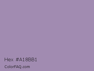 Hex #a18bb1 Color is a light purple color and the nearest color is Glossy Grape #ab92b3. Hex code #a18bb1 and RGB value is rgb(161,139,177). In RGB color space, this color is composed of 63% red, 55% green, 69% blue, In CMYK color space, this color is composed of 9% cyan, 21% magenta, 0% yellow , 31% black , In HSL color space, this color has a hue angle of 275° , 20% saturation and 62% lightness.