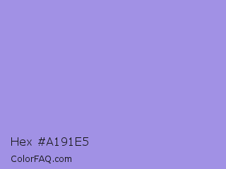 Hex #a191e5 Color is a light indigo color and the nearest color is Dull Lavender #a899e6. Hex code #a191e5 and RGB value is rgb(161,145,229). In RGB color space, this color is composed of 63% red, 57% green, 90% blue, In CMYK color space, this color is composed of 30% cyan, 37% magenta, 0% yellow , 10% black , In HSL color space, this color has a hue angle of 251° , 62% saturation and 73% lightness.
