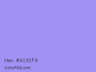 Hex #a191f4 Color is a light indigo color and the nearest color is Dull Lavender #a899e6. Hex code #a191f4 and RGB value is rgb(161,145,244). In RGB color space, this color is composed of 63% red, 57% green, 96% blue, In CMYK color space, this color is composed of 34% cyan, 41% magenta, 0% yellow , 4% black , In HSL color space, this color has a hue angle of 250° , 82% saturation and 76% lightness.