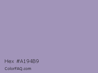 Hex #a194b9 Color is a light violet color and the nearest color is Amethyst Smoke #a397b4. Hex code #a194b9 and RGB value is rgb(161,148,185). In RGB color space, this color is composed of 63% red, 58% green, 73% blue, In CMYK color space, this color is composed of 13% cyan, 20% magenta, 0% yellow , 27% black , In HSL color space, this color has a hue angle of 261° , 21% saturation and 65% lightness.