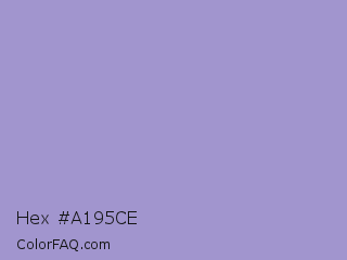 Hex #a195ce Color is a light indigo color and the nearest color is Blue Bell Crayola #9999cc. Hex code #a195ce and RGB value is rgb(161,149,206). In RGB color space, this color is composed of 63% red, 58% green, 81% blue, In CMYK color space, this color is composed of 22% cyan, 28% magenta, 0% yellow , 19% black , In HSL color space, this color has a hue angle of 253° , 37% saturation and 70% lightness.