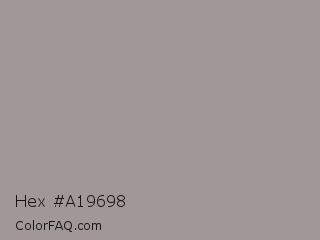 Hex #a19698 Color is a light red color and the nearest color is Dusty Gray #a8989b. Hex code #a19698 and RGB value is rgb(161,150,152). In RGB color space, this color is composed of 63% red, 59% green, 60% blue, In CMYK color space, this color is composed of 0% cyan, 7% magenta, 6% yellow , 37% black , In HSL color space, this color has a hue angle of 349° , 6% saturation and 61% lightness.