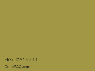 Hex #a19744 Color is a normal yellow color and the nearest color is Sycamore #908d39. Hex code #a19744 and RGB value is rgb(161,151,68). In RGB color space, this color is composed of 63% red, 59% green, 27% blue, In CMYK color space, this color is composed of 0% cyan, 6% magenta, 58% yellow , 37% black , In HSL color space, this color has a hue angle of 54° , 41% saturation and 45% lightness.