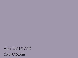 Hex #a197ad Color is a light violet color and the nearest color is Amethyst Smoke #a397b4. Hex code #a197ad and RGB value is rgb(161,151,173). In RGB color space, this color is composed of 63% red, 59% green, 68% blue, In CMYK color space, this color is composed of 7% cyan, 13% magenta, 0% yellow , 32% black , In HSL color space, this color has a hue angle of 267° , 12% saturation and 64% lightness.
