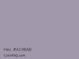 Hex #a198ab Color is a light violet color and the nearest color is Heliotrope Gray #aa98a9. Hex code #a198ab and RGB value is rgb(161,152,171). In RGB color space, this color is composed of 63% red, 60% green, 67% blue, In CMYK color space, this color is composed of 6% cyan, 11% magenta, 0% yellow , 33% black , In HSL color space, this color has a hue angle of 268° , 10% saturation and 63% lightness.