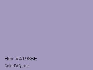 Hex #a198be Color is a light indigo color and the nearest color is Amethyst Smoke #a397b4. Hex code #a198be and RGB value is rgb(161,152,190). In RGB color space, this color is composed of 63% red, 60% green, 75% blue, In CMYK color space, this color is composed of 15% cyan, 20% magenta, 0% yellow , 25% black , In HSL color space, this color has a hue angle of 254° , 23% saturation and 67% lightness.
