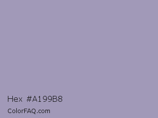 Hex #a199b8 Color is a light indigo color and the nearest color is Amethyst Smoke #a397b4. Hex code #a199b8 and RGB value is rgb(161,153,184). In RGB color space, this color is composed of 63% red, 60% green, 72% blue, In CMYK color space, this color is composed of 13% cyan, 17% magenta, 0% yellow , 28% black , In HSL color space, this color has a hue angle of 255° , 18% saturation and 66% lightness.