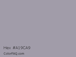 Hex #a19ca9 Color is a light violet color and the nearest color is Santas Gray #9fa0b1. Hex code #a19ca9 and RGB value is rgb(161,156,169). In RGB color space, this color is composed of 63% red, 61% green, 66% blue, In CMYK color space, this color is composed of 5% cyan, 8% magenta, 0% yellow , 34% black , In HSL color space, this color has a hue angle of 263° , 7% saturation and 64% lightness.