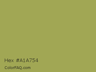 Hex #a1a754 Color is a normal yellow color and the nearest color is Husk #b7a458. Hex code #a1a754 and RGB value is rgb(161,167,84). In RGB color space, this color is composed of 63% red, 65% green, 33% blue, In CMYK color space, this color is composed of 4% cyan, 0% magenta, 50% yellow , 35% black , In HSL color space, this color has a hue angle of 64° , 33% saturation and 49% lightness.