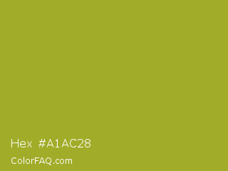 Hex #a1ac28 Color is a normal yellow color and the nearest color is Citron #9fa91f. Hex code #a1ac28 and RGB value is rgb(161,172,40). In RGB color space, this color is composed of 63% red, 67% green, 16% blue, In CMYK color space, this color is composed of 6% cyan, 0% magenta, 77% yellow , 33% black , In HSL color space, this color has a hue angle of 65° , 62% saturation and 42% lightness.