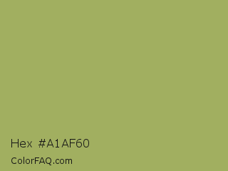 Hex #a1af60 Color is a normal lime color and the nearest color is Green Smoke #a4af6e. Hex code #a1af60 and RGB value is rgb(161,175,96). In RGB color space, this color is composed of 63% red, 69% green, 38% blue, In CMYK color space, this color is composed of 8% cyan, 0% magenta, 45% yellow , 31% black , In HSL color space, this color has a hue angle of 71° , 33% saturation and 53% lightness.