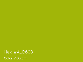 Hex #a1b608 Color is a normal yellow color and the nearest color is Pistachio Green #9dc209. Hex code #a1b608 and RGB value is rgb(161,182,8). In RGB color space, this color is composed of 63% red, 71% green, 3% blue, In CMYK color space, this color is composed of 12% cyan, 0% magenta, 96% yellow , 29% black , In HSL color space, this color has a hue angle of 67° , 92% saturation and 37% lightness.