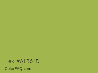 Hex #a1b64d Color is a normal lime color and the nearest color is Middle Green Yellow #acbf60. Hex code #a1b64d and RGB value is rgb(161,182,77). In RGB color space, this color is composed of 63% red, 71% green, 30% blue, In CMYK color space, this color is composed of 12% cyan, 0% magenta, 58% yellow , 29% black , In HSL color space, this color has a hue angle of 72° , 42% saturation and 51% lightness.