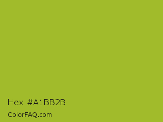 Hex #a1bb2b Color is a normal lime color and the nearest color is Android Green #a4c639. Hex code #a1bb2b and RGB value is rgb(161,187,43). In RGB color space, this color is composed of 63% red, 73% green, 17% blue, In CMYK color space, this color is composed of 14% cyan, 0% magenta, 77% yellow , 27% black , In HSL color space, this color has a hue angle of 71° , 63% saturation and 45% lightness.