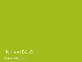 Hex #a1bc1b Color is a normal yellow color and the nearest color is Acid Green #b0bf1a. Hex code #a1bc1b and RGB value is rgb(161,188,27). In RGB color space, this color is composed of 63% red, 74% green, 11% blue, In CMYK color space, this color is composed of 14% cyan, 0% magenta, 86% yellow , 26% black , In HSL color space, this color has a hue angle of 70° , 75% saturation and 42% lightness.