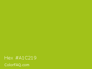Hex #a1c219 Color is a normal lime color and the nearest color is Citrus #a1c50a. Hex code #a1c219 and RGB value is rgb(161,194,25). In RGB color space, this color is composed of 63% red, 76% green, 10% blue, In CMYK color space, this color is composed of 17% cyan, 0% magenta, 87% yellow , 24% black , In HSL color space, this color has a hue angle of 72° , 77% saturation and 43% lightness.