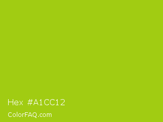 Hex #a1cc12 Color is a normal lime color and the nearest color is Bahia #a5cb0c. Hex code #a1cc12 and RGB value is rgb(161,204,18). In RGB color space, this color is composed of 63% red, 80% green, 7% blue, In CMYK color space, this color is composed of 21% cyan, 0% magenta, 91% yellow , 20% black , In HSL color space, this color has a hue angle of 74° , 84% saturation and 44% lightness.