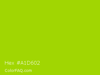 Hex #a1d602 Color is a normal lime color and the nearest color is Vivid Lime Green #a6d608. Hex code #a1d602 and RGB value is rgb(161,214,2). In RGB color space, this color is composed of 63% red, 84% green, 1% blue, In CMYK color space, this color is composed of 25% cyan, 0% magenta, 99% yellow , 16% black , In HSL color space, this color has a hue angle of 75° , 98% saturation and 42% lightness.