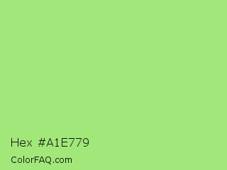 Hex #a1e779 Color is a light green color and the nearest color is Feijoa #9fdd8c. Hex code #a1e779 and RGB value is rgb(161,231,121). In RGB color space, this color is composed of 63% red, 91% green, 47% blue, In CMYK color space, this color is composed of 30% cyan, 0% magenta, 48% yellow , 9% black , In HSL color space, this color has a hue angle of 98° , 70% saturation and 69% lightness.