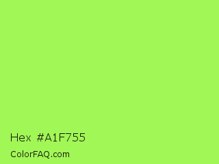Hex #a1f755 Color is a light green color and the nearest color is Inchworm #b2ec5d. Hex code #a1f755 and RGB value is rgb(161,247,85). In RGB color space, this color is composed of 63% red, 97% green, 33% blue, In CMYK color space, this color is composed of 35% cyan, 0% magenta, 66% yellow , 3% black , In HSL color space, this color has a hue angle of 92° , 91% saturation and 65% lightness.