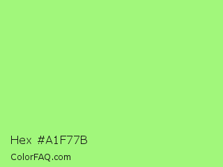 Hex #a1f77b Color is a light green color and the nearest color is Light Green #90ee90. Hex code #a1f77b and RGB value is rgb(161,247,123). In RGB color space, this color is composed of 63% red, 97% green, 48% blue, In CMYK color space, this color is composed of 35% cyan, 0% magenta, 50% yellow , 3% black , In HSL color space, this color has a hue angle of 102° , 89% saturation and 73% lightness.