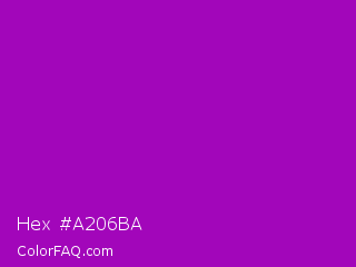 Hex #a206ba Color is a normal magenta color and the nearest color is Heliotrope Magenta #aa00bb. Hex code #a206ba and RGB value is rgb(162,6,186). In RGB color space, this color is composed of 64% red, 2% green, 73% blue, In CMYK color space, this color is composed of 13% cyan, 97% magenta, 0% yellow , 27% black , In HSL color space, this color has a hue angle of 292° , 94% saturation and 38% lightness.