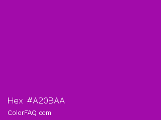 Hex #a20baa Color is a normal magenta color and the nearest color is Violet Eggplant #991199. Hex code #a20baa and RGB value is rgb(162,11,170). In RGB color space, this color is composed of 64% red, 4% green, 67% blue, In CMYK color space, this color is composed of 5% cyan, 94% magenta, 0% yellow , 33% black , In HSL color space, this color has a hue angle of 297° , 88% saturation and 35% lightness.
