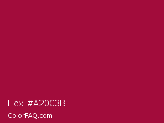 Hex #a20c3b Color is a normal rose color and the nearest color is Pink Raspberry #980036. Hex code #a20c3b and RGB value is rgb(162,12,59). In RGB color space, this color is composed of 64% red, 5% green, 23% blue, In CMYK color space, this color is composed of 0% cyan, 93% magenta, 64% yellow , 36% black , In HSL color space, this color has a hue angle of 341° , 86% saturation and 34% lightness.