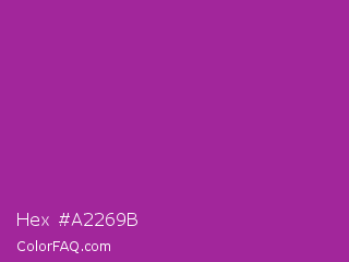 Hex #a2269b Color is a normal magenta color and the nearest color is Violet Eggplant #991199. Hex code #a2269b and RGB value is rgb(162,38,155). In RGB color space, this color is composed of 64% red, 15% green, 61% blue, In CMYK color space, this color is composed of 0% cyan, 77% magenta, 4% yellow , 36% black , In HSL color space, this color has a hue angle of 303° , 62% saturation and 39% lightness.