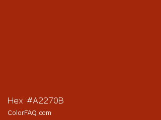 Hex #a2270b Color is a normal red color and the nearest color is Tabasco #a02712. Hex code #a2270b and RGB value is rgb(162,39,11). In RGB color space, this color is composed of 64% red, 15% green, 4% blue, In CMYK color space, this color is composed of 0% cyan, 76% magenta, 93% yellow , 36% black , In HSL color space, this color has a hue angle of 11° , 87% saturation and 34% lightness.