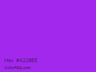 Hex #a228ee Color is a normal purple color and the nearest color is Veronica #a020f0. Hex code #a228ee and RGB value is rgb(162,40,238). In RGB color space, this color is composed of 64% red, 16% green, 93% blue, In CMYK color space, this color is composed of 32% cyan, 83% magenta, 0% yellow , 7% black , In HSL color space, this color has a hue angle of 277° , 85% saturation and 55% lightness.
