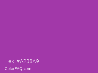 Hex #a238a9 Color is a normal magenta color and the nearest color is Purpureus #9a4eae. Hex code #a238a9 and RGB value is rgb(162,56,169). In RGB color space, this color is composed of 64% red, 22% green, 66% blue, In CMYK color space, this color is composed of 4% cyan, 67% magenta, 0% yellow , 34% black , In HSL color space, this color has a hue angle of 296° , 50% saturation and 44% lightness.