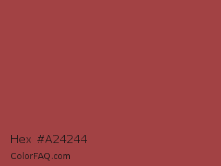 Hex #a24244 Color is a normal red color and the nearest color is Copper Rust #944747. Hex code #a24244 and RGB value is rgb(162,66,68). In RGB color space, this color is composed of 64% red, 26% green, 27% blue, In CMYK color space, this color is composed of 0% cyan, 59% magenta, 58% yellow , 36% black , In HSL color space, this color has a hue angle of 359° , 42% saturation and 45% lightness.
