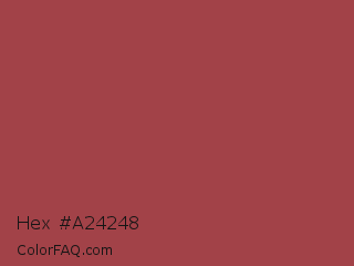 Hex #a24248 Color is a normal red color and the nearest color is Copper Rust #944747. Hex code #a24248 and RGB value is rgb(162,66,72). In RGB color space, this color is composed of 64% red, 26% green, 28% blue, In CMYK color space, this color is composed of 0% cyan, 59% magenta, 56% yellow , 36% black , In HSL color space, this color has a hue angle of 356° , 42% saturation and 45% lightness.