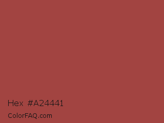 Hex #a24441 Color is a normal red color and the nearest color is Copper Rust #944747. Hex code #a24441 and RGB value is rgb(162,68,65). In RGB color space, this color is composed of 64% red, 27% green, 25% blue, In CMYK color space, this color is composed of 0% cyan, 58% magenta, 60% yellow , 36% black , In HSL color space, this color has a hue angle of 2° , 43% saturation and 45% lightness.