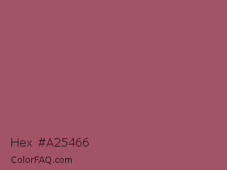 Hex #a25466 Color is a normal red color and the nearest color is China Rose #a8516e. Hex code #a25466 and RGB value is rgb(162,84,102). In RGB color space, this color is composed of 64% red, 33% green, 40% blue, In CMYK color space, this color is composed of 0% cyan, 48% magenta, 37% yellow , 36% black , In HSL color space, this color has a hue angle of 346° , 32% saturation and 48% lightness.