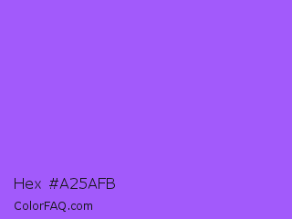 Hex #a25afb Color is a light violet color and the nearest color is Navy Purple #9457eb. Hex code #a25afb and RGB value is rgb(162,90,251). In RGB color space, this color is composed of 64% red, 35% green, 98% blue, In CMYK color space, this color is composed of 35% cyan, 64% magenta, 0% yellow , 2% black , In HSL color space, this color has a hue angle of 267° , 95% saturation and 67% lightness.