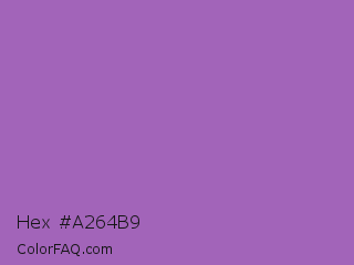 Hex #a264b9 Color is a normal purple color and the nearest color is Wisteria #9771b5. Hex code #a264b9 and RGB value is rgb(162,100,185). In RGB color space, this color is composed of 64% red, 39% green, 73% blue, In CMYK color space, this color is composed of 12% cyan, 46% magenta, 0% yellow , 27% black , In HSL color space, this color has a hue angle of 284° , 38% saturation and 56% lightness.
