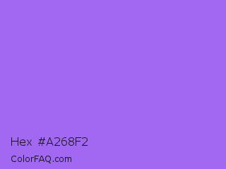 Hex #a268f2 Color is a light violet color and the nearest color is Navy Purple #9457eb. Hex code #a268f2 and RGB value is rgb(162,104,242). In RGB color space, this color is composed of 64% red, 41% green, 95% blue, In CMYK color space, this color is composed of 33% cyan, 57% magenta, 0% yellow , 5% black , In HSL color space, this color has a hue angle of 265° , 84% saturation and 68% lightness.