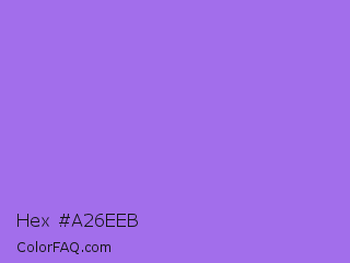 Hex #a26eeb Color is a light violet color and the nearest color is Medium Purple #9370db. Hex code #a26eeb and RGB value is rgb(162,110,235). In RGB color space, this color is composed of 64% red, 43% green, 92% blue, In CMYK color space, this color is composed of 31% cyan, 53% magenta, 0% yellow , 8% black , In HSL color space, this color has a hue angle of 265° , 76% saturation and 68% lightness.