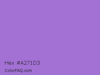 Hex #a271d3 Color is a light violet color and the nearest color is Rich Lavender #a76bcf. Hex code #a271d3 and RGB value is rgb(162,113,211). In RGB color space, this color is composed of 64% red, 44% green, 83% blue, In CMYK color space, this color is composed of 23% cyan, 46% magenta, 0% yellow , 17% black , In HSL color space, this color has a hue angle of 270° , 53% saturation and 64% lightness.