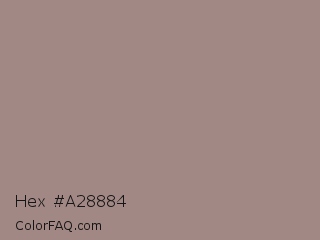 Hex #a28884 Color is a normal red color and the nearest color is Pharlap #a3807b. Hex code #a28884 and RGB value is rgb(162,136,132). In RGB color space, this color is composed of 64% red, 53% green, 52% blue, In CMYK color space, this color is composed of 0% cyan, 16% magenta, 19% yellow , 36% black , In HSL color space, this color has a hue angle of 8° , 14% saturation and 58% lightness.