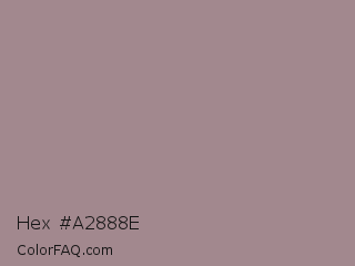 Hex #a2888e Color is a normal red color and the nearest color is Venus #928590. Hex code #a2888e and RGB value is rgb(162,136,142). In RGB color space, this color is composed of 64% red, 53% green, 56% blue, In CMYK color space, this color is composed of 0% cyan, 16% magenta, 12% yellow , 36% black , In HSL color space, this color has a hue angle of 346° , 12% saturation and 58% lightness.
