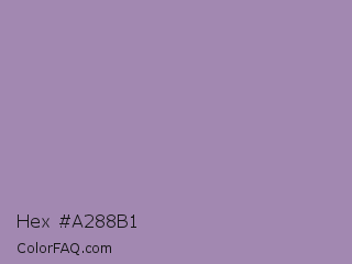 Hex #a288b1 Color is a light purple color and the nearest color is Glossy Grape #ab92b3. Hex code #a288b1 and RGB value is rgb(162,136,177). In RGB color space, this color is composed of 64% red, 53% green, 69% blue, In CMYK color space, this color is composed of 8% cyan, 23% magenta, 0% yellow , 31% black , In HSL color space, this color has a hue angle of 278° , 21% saturation and 61% lightness.