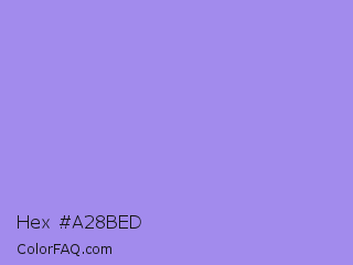 Hex #a28bed Color is a light indigo color and the nearest color is Dull Lavender #a899e6. Hex code #a28bed and RGB value is rgb(162,139,237). In RGB color space, this color is composed of 64% red, 55% green, 93% blue, In CMYK color space, this color is composed of 32% cyan, 41% magenta, 0% yellow , 7% black , In HSL color space, this color has a hue angle of 254° , 73% saturation and 74% lightness.