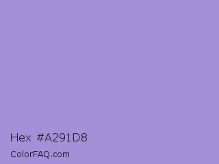 Hex #a291d8 Color is a light indigo color and the nearest color is East Side #ac91ce. Hex code #a291d8 and RGB value is rgb(162,145,216). In RGB color space, this color is composed of 64% red, 57% green, 85% blue, In CMYK color space, this color is composed of 25% cyan, 33% magenta, 0% yellow , 15% black , In HSL color space, this color has a hue angle of 254° , 48% saturation and 71% lightness.
