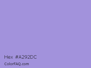 Hex #a292dc Color is a light indigo color and the nearest color is Dull Lavender #a899e6. Hex code #a292dc and RGB value is rgb(162,146,220). In RGB color space, this color is composed of 64% red, 57% green, 86% blue, In CMYK color space, this color is composed of 26% cyan, 34% magenta, 0% yellow , 14% black , In HSL color space, this color has a hue angle of 253° , 51% saturation and 72% lightness.